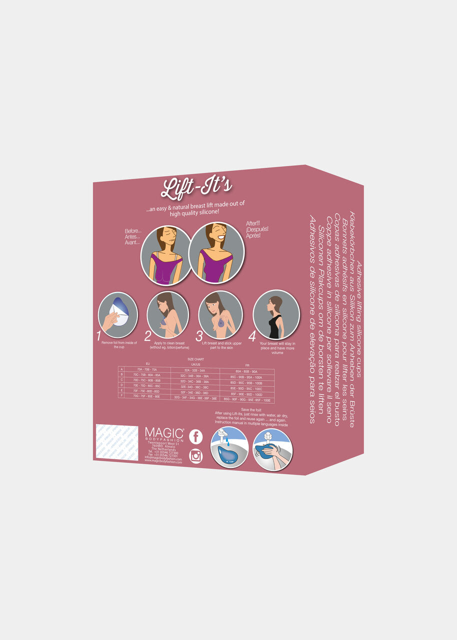 Coussinets en silicone complètement invisibles qui élèvent vos seins sans avoir besoin de porter un soutien-gorge. Cette solution est idéale pour les tenues dos nus, décolletés et plongeantes. Après avoir appliqué le produit sur le sein, vous pouvez utiliser la bande plus longue pour créer un bel effet remonté. Plus la taille est grande, plus la bande est longue. Ainsi, même avec une taille de coussinet plus grande, vous pouvez créer la solution dos nu parfaite. Un paquet contient une paire de Lift-it's qui peut être utilisée plusieurs fois.